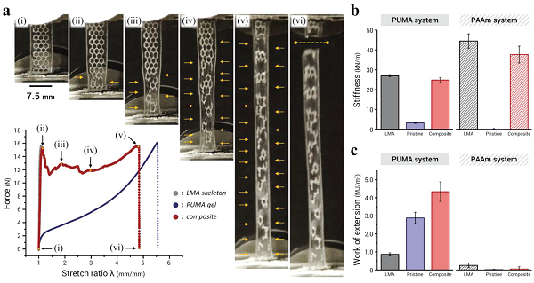 a)蜂窝网状LMA骨架(灰色),原始PUMA凝胶(深蓝色)和它们的复合物(酒红色)的拉伸曲线。插图(i)-(vi)表示在加载曲线中显示的相应延伸的复合材料试样的照片。最初,复合材料的力迅速增加,并且LMA骨架出现断裂现象((i)和(ii))。在进一步拉伸样品((ii)-(v))期间,观察到LMA骨架的断裂点增加(插入箭头所指示的断裂点),而水凝胶基体仍保持整体完整性,没有发生块体断裂。最后,水凝胶基质在虚线(vi)所示的位置破裂;