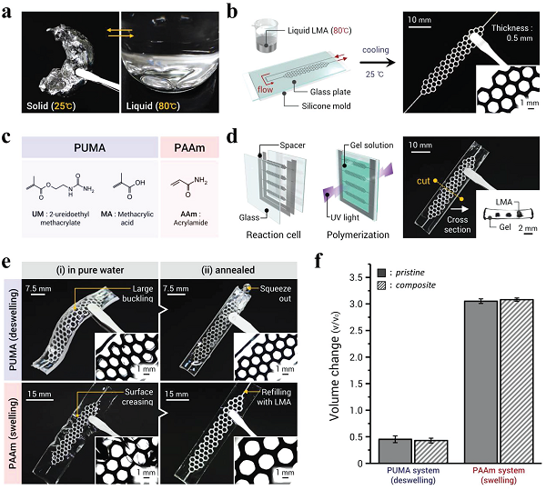 e)在(i)之前和(ii)热退火处理之后,在纯水中平衡的复合材料的照片。由于PUMA(或PAAm)在水中的收缩(或膨胀),引起凝胶和LMA固体骨架之间的失配,能观察到大的屈曲(或表面皱褶)。通过将样品浸入80℃水中进行热退火之后,由于LMA的熔化,溶胀不匹配自发释放(嵌入图像是从顶部方向观察的光学显微镜图像);