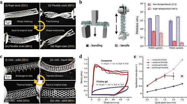 该研究团队发明了一种基于低熔点合金(LMA)的水凝胶复合材料,其背后的设计思路和制备方法有助于开发无溶胀失配引起物理变形的水凝胶复合材料。该水凝胶复合材料具有与LMA相类似的高刚度,且表现出大于单一组分的韧性。此外,还有诸多功能性,比如利用LMA的固-液相变,可以通过热刺激引发显著的刚度变化,使材料具备快速、高效的热愈合性能;能在水凝胶基体中进行电化学反应;在水凝胶中制造通道结构用于流体装置等。这项工作可能在设计开发柔性机器人、可穿戴电子设备和生物相容功能材料中发挥重要作用。