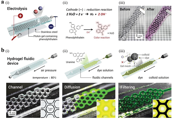 b)展示出利用LMA骨架作为通道模板的PAAm水凝胶流体装置: i)通道结构的照片和光学显微镜图像(插图),ii)通过绿色染料分子(尿紫酸)扩散到水凝胶基体(插图)中,证明水凝胶流体通道,iii)水凝胶把黑色胶体颗粒(墨水)从绿色染料(尿素)中过滤掉。上排展示的是通道的制备(i),染料扩散(ii)和过滤(iii)过程。
