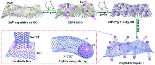 近日,在上海复旦大学吴仁兵教授、孙大林教授和方方教授(共同通讯作者)团队的带领下,与上海材料创新研究院、中科院物理研究所和美国劳伦斯伯克利国家实验室合作,开发了一种新型有效的方法,通过直接退火氧化石墨烯(GO)的方法,合成了接枝在还原氧化石墨烯(rGO)(Co@N-CNTs@rGO)两侧的N掺杂碳纳米管(N-CNTs)包裹的核-壳双金属沸石咪唑酯骨架。独特的核-壳ZIF-67@ZIF-8有助于通过原位形成非常薄的N-CNT包裹超细Co纳米颗粒,而GO可以作为基质来松弛CNT并确保足够的空间为了它们的生长,避免高温下的颗粒和碳聚集。此外,通过ZIF-67@ZIF-8覆盖GO被认为暴露更多的催化位点。所制备的Co@N-CNTs@rGO复合材料表现出优异的氢析反应电催化活性,其复合材料在达到10mAcm-2时,在1MKOH和0.5MH2SO4中分别只有108和87mV的过电位,分别比在大pH范围内报道的大多数钴基电催化剂好得多。更重要的是,所开发的策略是可控的和多功能的,并且可以容易地扩展以制备具有优异电催化性能的二元和三元过渡金属合金@N-CNTs@rGO杂化物。相关成果以题为“Ultrafine Co Nano particles Encapsulated in Carbon-Nanotubes-Grafted Graphene Sheets as Advanced Electrocatalysts for the Hydrogen Evolution Reaction”发表在了Adv.Mater.上。