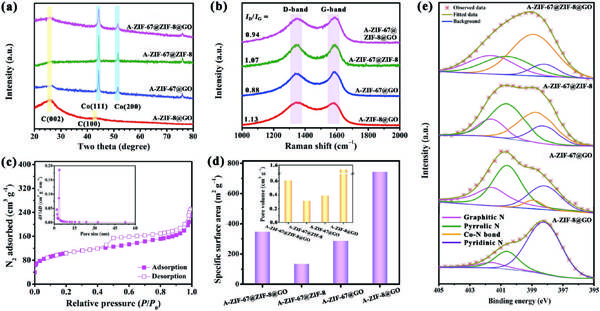 (e)为A-ZIF-67@ZIF-8@GO,A-ZIF-67@ZIF-8,A-ZIF-67@GO和A-ZIF-8@GO复合材料的高分辨率N 1s XPS光谱图。