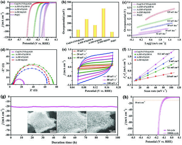 (a-f)为Co@N-CNTs@rGO,A-ZIF-8@GO,A-ZIF-67@GO和A-ZIF-67@ZIF-8电极的LSV曲线(a),在10mAcm-2的电流密度时的过电位(b),中塔菲尔斜率(c),EIS光谱(d),Cdl值(f);