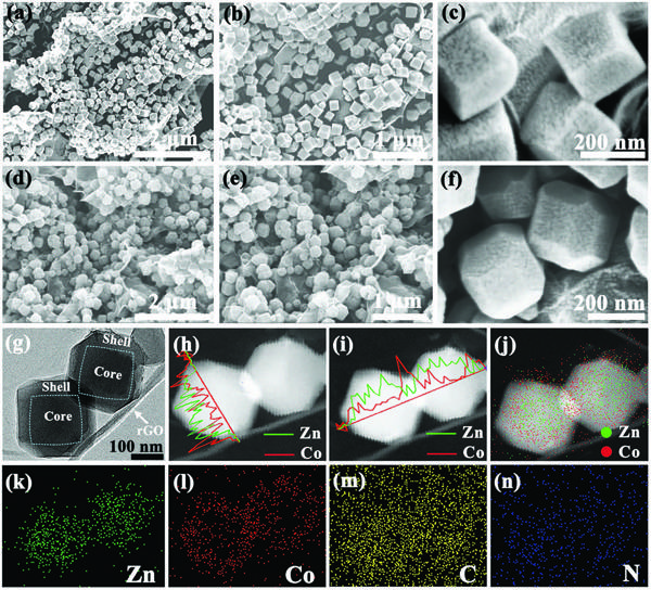 (h-i)为A-ZIF-67@ZIF-8@GO复合材料的Co(i),C(j)和N(k)的元素分布的HAADF-STEM图像;