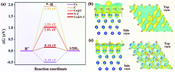 (b,c)分别为Co@C-H体系(Co和C-H/N-C-H之间的电荷转移)和Co@N-C-H体系的电荷密度重新分布(蓝色,棕色,白色和粉红色的原子分别代表Co,C,N和H原子;在电荷密度等值面图上,蓝色表示电荷损失,黄色等值面表示电子获得)。N掺杂降低了C平面内的电荷极化,但是电子掺杂该体系以便将来增加C-H键的强度。