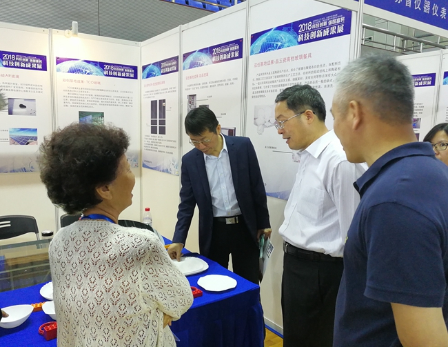 我们展出了双创基地成果-太阳能晶体硅AR玻璃、 TCO玻璃、隐透镀膜彩晶玻璃、晶玉瓷高档玻璃餐具。省科协党组书记孙春雷、省科协副主席徐春生、省科协学会部部长李政等领导观看了我会玻璃功能化双创基地成果,仔细询问了晶玉瓷高档玻璃餐具的性能、特点和用途以及市场应用的情况。