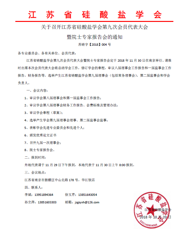 关于召开江苏省硅酸盐学会第九次会员代表大会暨院士专家报告会的通知
