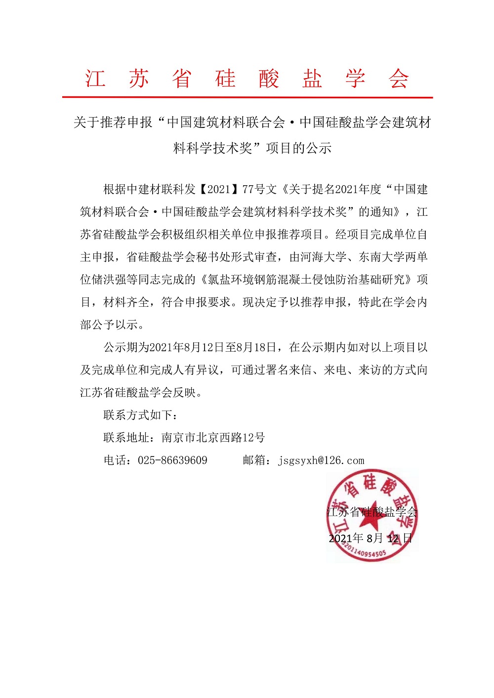 关于推荐申报“中国建筑材料联合会·中国硅酸盐学会建筑材 料科学技术奖”项目的公示