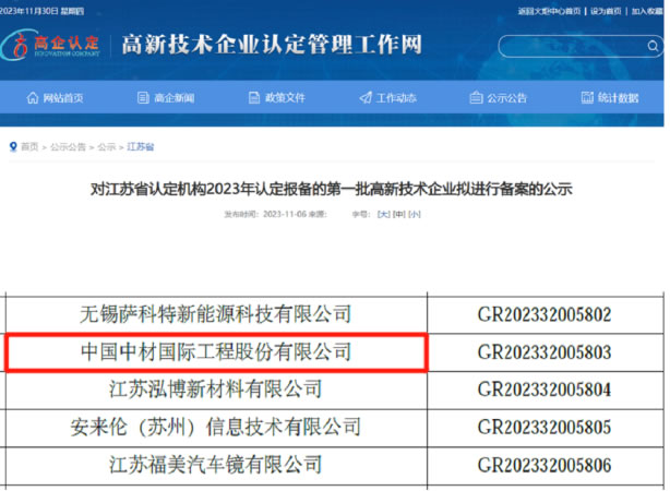 近日,全国高新技术企业认定管理工作领导小组办公室发布《对江苏省认定机构2023年认定报备的第一批高新技术企业拟进行备案的公示》,中材国际(南京)再次通过国家高新技术企业资格认定。这是自2011年高企严格复审以来,公司连续第五次通过国家级高新技术企业认定。