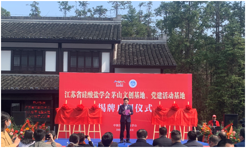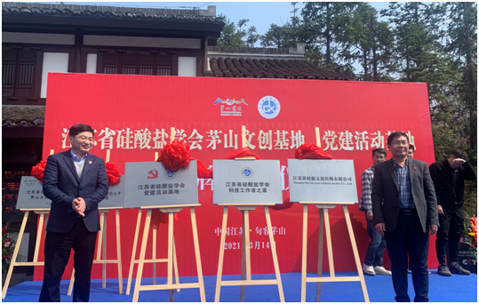 2021年3月14日上午,江苏省硅酸盐学会文创基地、党建活动基地在茅山风景区揭牌。江苏省硅酸盐学会理事长刘加平,俄罗斯自然科学院外籍院士、乌克兰国家工程院外籍院士、江苏大学教授李松军,江苏省工艺美术大师、江苏省陶瓷艺术大师、宜兴市陶瓷学会会长方卫明,茅山管委会主任桑学军、茅山湖管理办公室副主任朱燕等参加揭牌仪式,江苏省环境科学学会、江苏省能源研究会、江苏省仪器仪表学会等兄弟学会到场祝贺,江苏省硅酸盐学会秘书长李斌主持揭牌仪式。