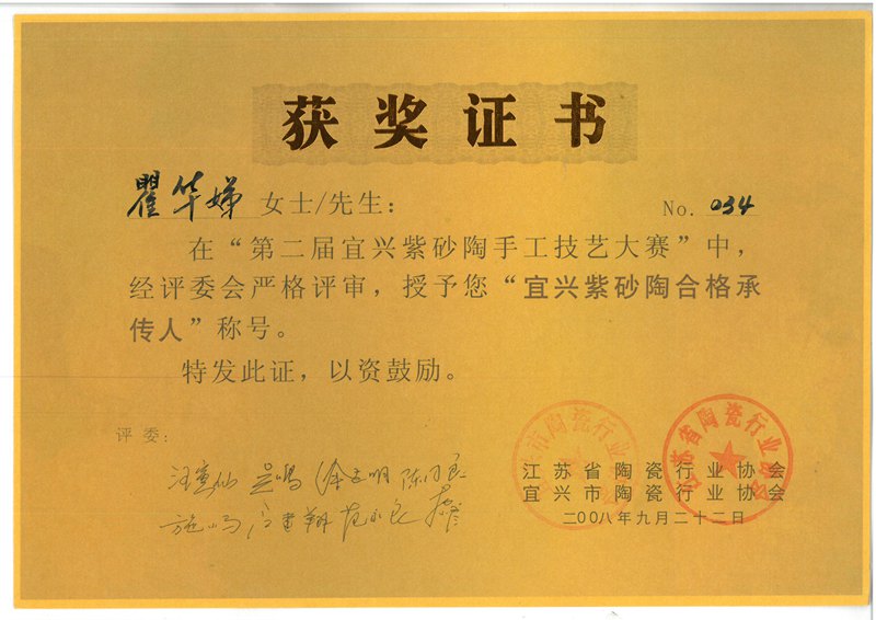 2008年荣获“宜兴市紫砂陶合格承传人”称号