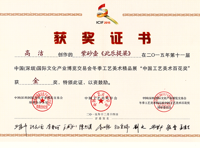 2015-12-14紫砂壶《此乐提梁》在2015年第十一届中国(深圳)国际文化产业博览交易会冬季工艺美术精品展“中国工艺美术百花奖”获金奖